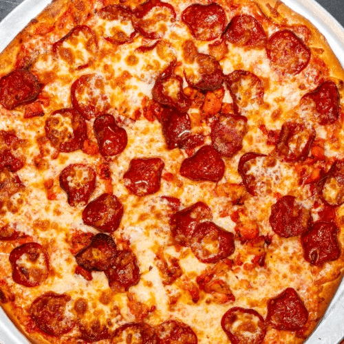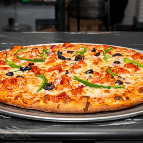 Green peppers, onions, mushrooms, tomatoes, olives and broccoli over our traditional pizza sauce and mozzarella and cheddar cheese blend.